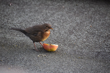 Turdus merula, Blackbird eating an apple on the ground