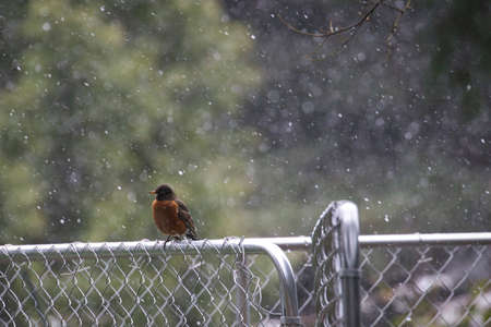red robin on a fence white its snowing