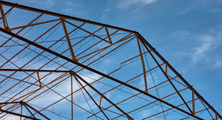 Steel truss made of metal corners against the blue sky. Structure of steel roof frame for building construction. Framework detail of metal bridge. Closeup bottom view