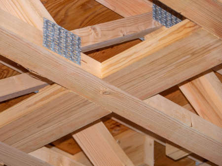 Close-up of wooden roof trusses with metal brackets in a house under construction, showcasing structural framework and carpentry against a clear blue sky.