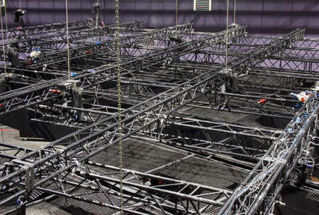 Black steel trusses are lifted by chain hoists. Installation of professional rigging equipment for a concert show.