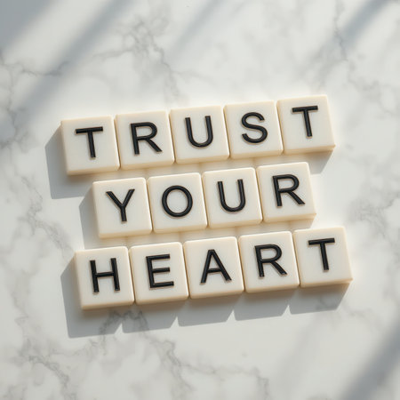 A minimalist arrangement of letter tiles spelling Trust Your Heart on a smooth marble surface, creating a calm and inspiring atmosphere for home decor or motivation.