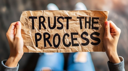Woman holds trust the process sign, symbolizing motivation and success on blurred background.