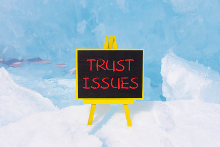 Trust issues symbol. Concept word Trust issues on beautiful black blackboard. Beautiful Baikal blue ice and snow background. Black blackboard. Business trust issues concept. Copy space.