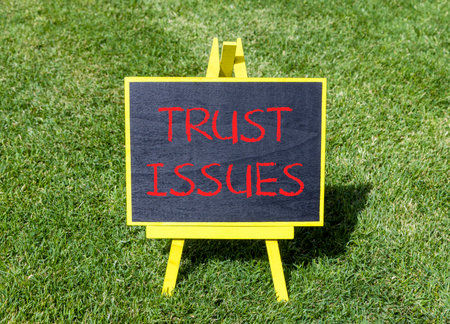 Trust issues symbol. Concept word Trust issues on beautiful black blackboard. Beautiful green grass lawn background. Black blackboard. Business trust issues concept. Copy space.