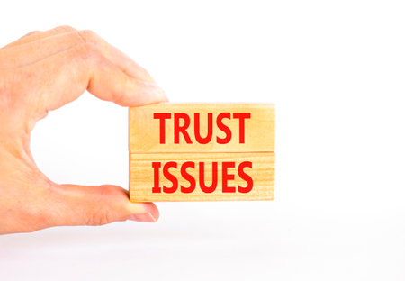 Trust issues symbol. Concept word Trust issues on beautiful wooden blocks. Beautiful white paper background. Businessman's hand. Business trust issues concept. Copy space.