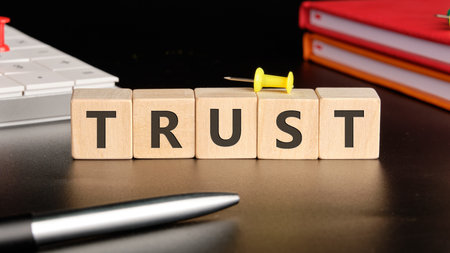 Wooden blocks spelling TRUST with handshake icon symbolizing reliability honesty and partnership in business perfect for concepts of teamwork customer relationship and corporate integrity