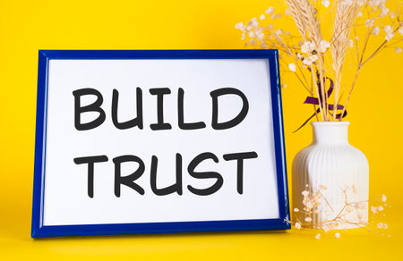 Build trust symbol. Concept words Build trust on beautiful wooden picture frame. Beautiful yellow background with flower vase. Business and Build trust concept. Copy space.