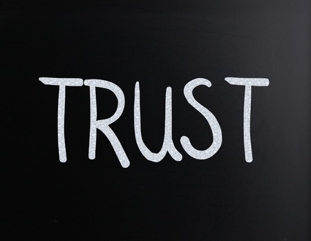 The word Trust handwritten with white chalk on a blackboard