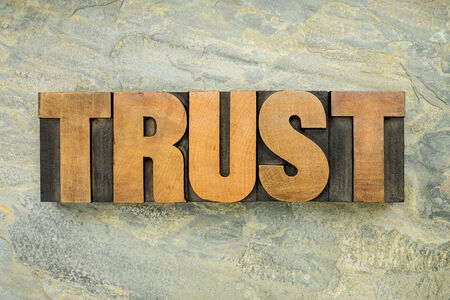 trust - a word in vintage letterpress wood type on a green slate rock background
