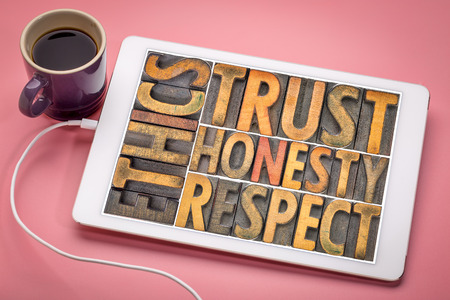 ethics, trust, honesty, respect - word abstract in vintage letterpress wood type blocks on a digital tbalet with a cup of coffee