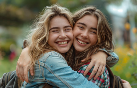Joyful embrace: young hispanic females sharing a happy hug outdoors.
