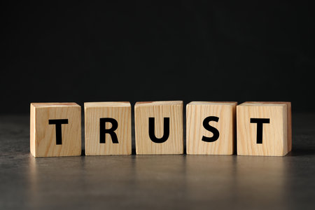 Wooden blocks with the word Trust. Trust relationships between business partners, friends, relatives.