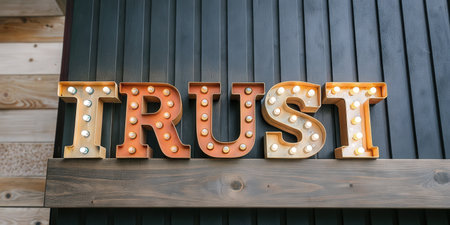 Illuminated Trust Sign with Vintage Marquee Lights on Rustic Wood Background
