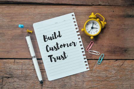 Top view of clock, pen, paper clips and white paper written with text BUILD CUSTOMER TRUST.