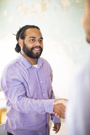 Two stylish men in shirtsshaking handsnear a wall with a near a wall with a textured plaster