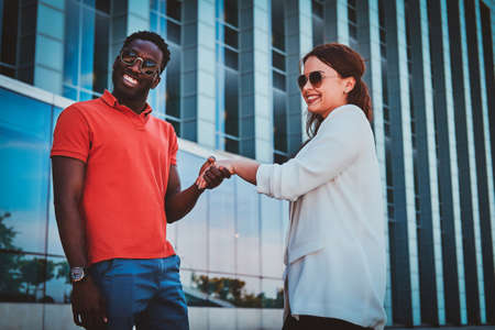 Happy smiling bisness partners in sunglasses meeteng up near glass building at city centre.