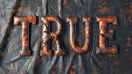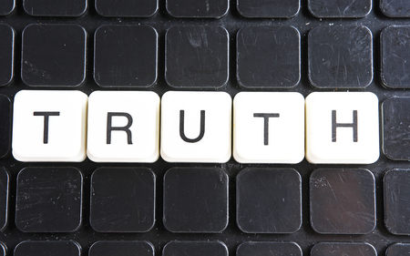 Truth text word title caption label cover backdrop background. Alphabet letter toy blocks on black reflective background. White alphabetical letters. White educational toy block with words.