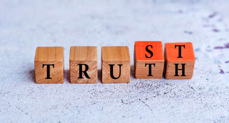 Wooden cubes and changes the word 'Truth' to 'Trust'. Beautiful white background.
