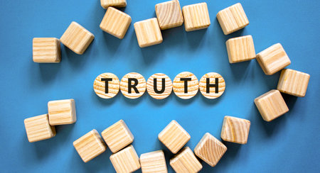 Truth symbol. Concept word Truth on beautiful wooden circles. Beautiful blue table blue background. Beautiful wooden cubes. Business lifestyle truth concept. Copy space.