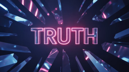 The word TRUTH glows in neon pink letters against a dark background. Sharp, translucent crystal shards in shades of blue and pink radiate outwards from the center, creating a dynamic and fragmented effect.
