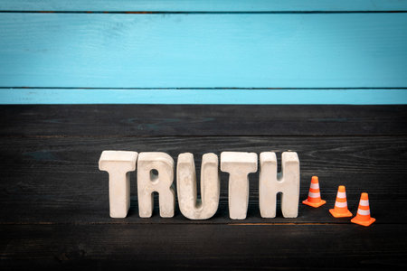Truth. Concrete Word with Safety Cones on Dark Wood and Blue Background