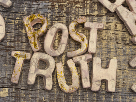The word TRUTH spelled out with textured and colorful wooden letters on a white background.