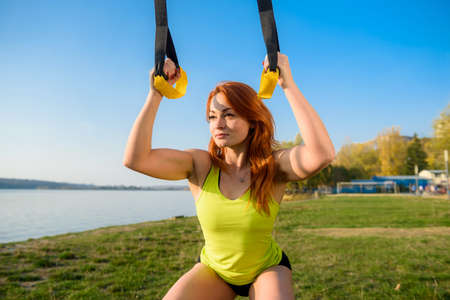 A young sportswoman doing exercise with TRX fitness straps outdoors.