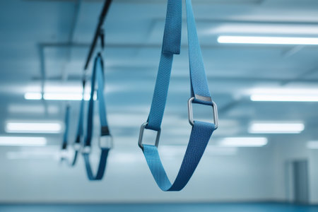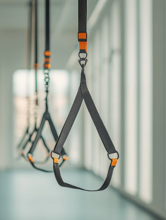 Fitness straps hang gracefully from the ceiling in a well lit space, creating a balanced geometric design that encourages movement and activity.