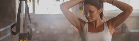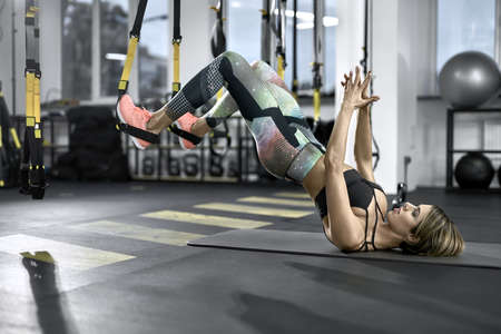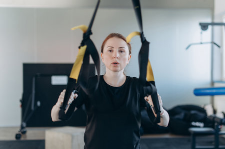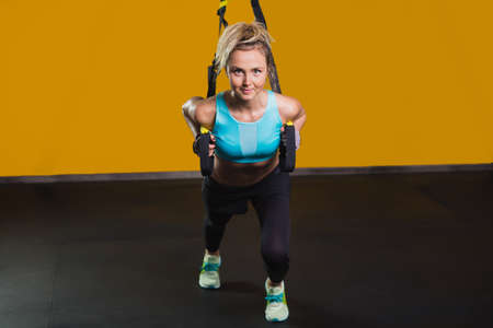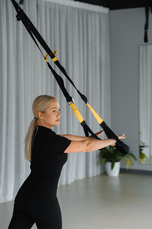 Portrait of beautiful woman doing hard suspension training with fitness straps in a fitness center. Healthy and sporty lifestyle concept.