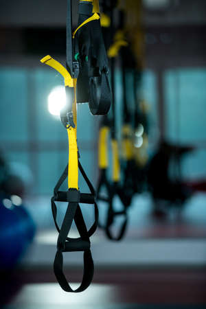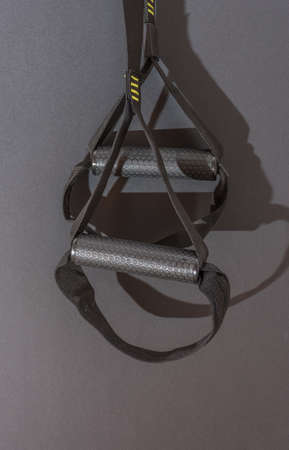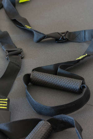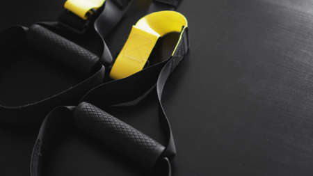 Black and yellow strap functional training equipment on grey background. Sport accessories. Fitness and Gym workout items for Healthy. Banner TRX