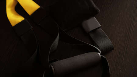 Closeup view of suspension on black wooden background training at home - Fitness at home