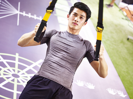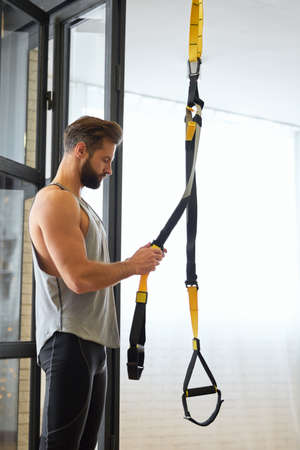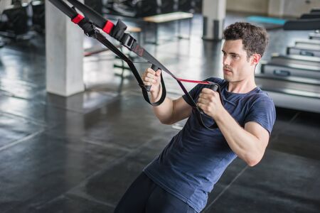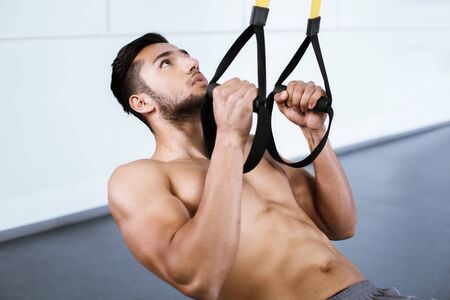 Athlete sporty man doing exercise with fitness straps to strengthen his abdominal muscle in gym.