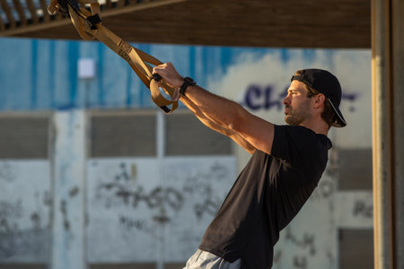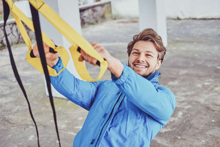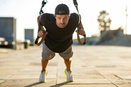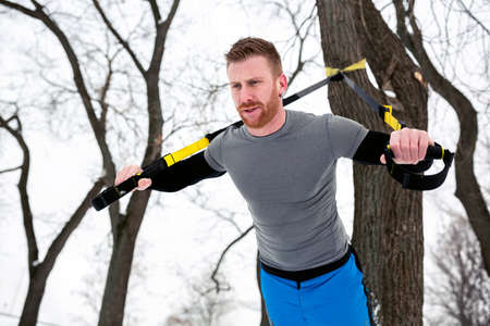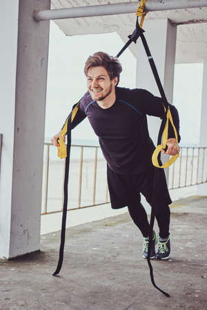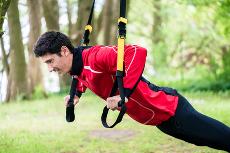 yound sporty athlete or bodybuilder has fitness workout with trx outdoor