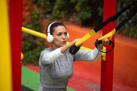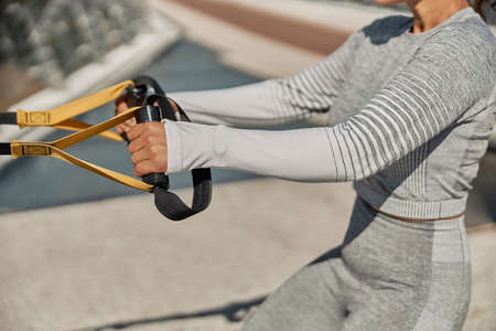 young female athlete doing morning exercises training with trx fitness straps in the park. Concept of healthy workout and lifestyle