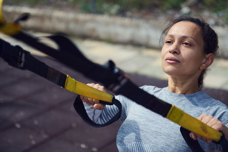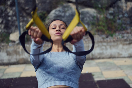 Woman using suspension straps for an outdoor workout in the sun. Demonstrating fitness, strength, and a healthy lifestyle. Dressed in stylish activewear, focusing on motivation and well-being.