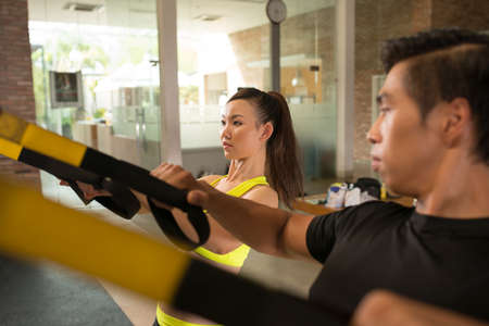 Young Asian female athlete training with trx strap hanging body for training with body resistance system in fitness gym.