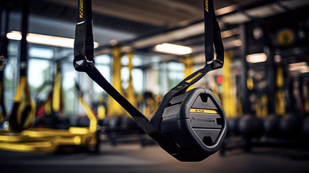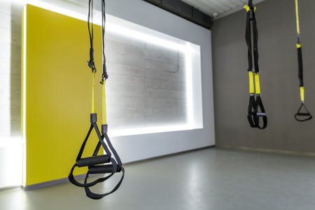 Contemporary gym interior with suspension straps ready for group functional workouts and resistance training sessions