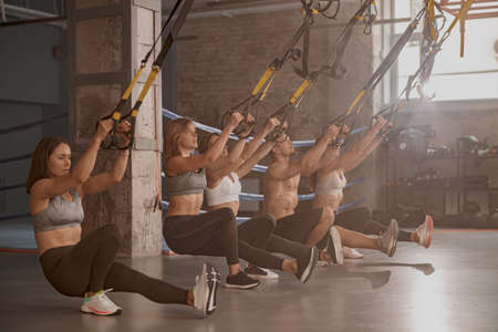 The Training Space. Group of sportive people doing fitness TRX training exercises at industrial gym. Push-up, group workout concept