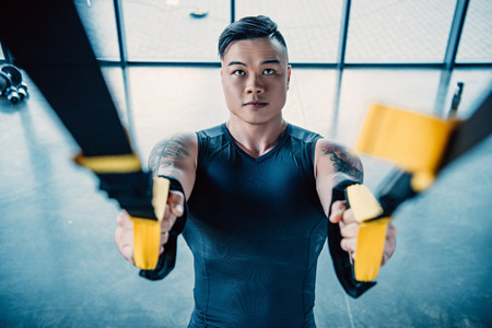 panoramic shot of handsome sportsman working out on suspension trainer in sports center