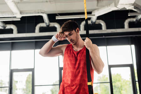 exhausted and sweaty sportsman standing and touching face near resistance bands in gym