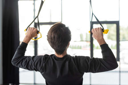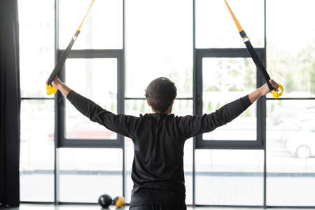 Back view of brunette sportsman pulling suspension straps while training in gym