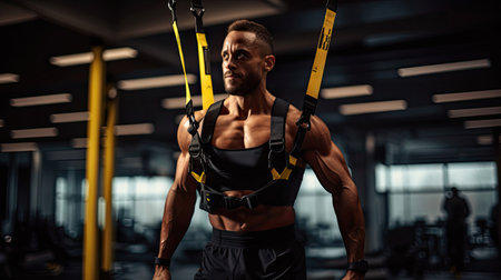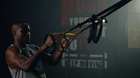 Black muscular man during exercise training workout bodyweight with suspension straps TRX pull ups training arms at stylish empty gym center fitness GYM, workout healthy lifestyle sport concept