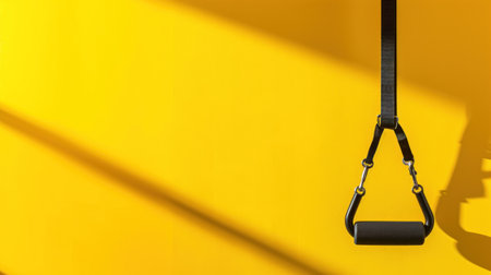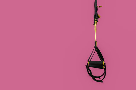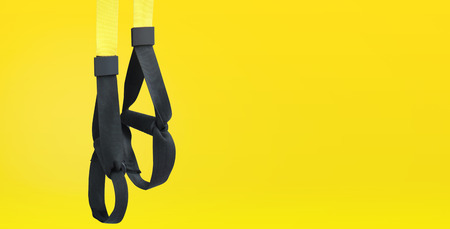 Straps training loop equipment. Black loop functional training equipment on yellow background. Sport accessories. Fitness and Gym workout items for Healthy. Advertising banner