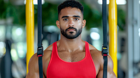 A muscular man in a red tank top stands confidently in a gym, gripping straps. The background is blurred, showing gym equipment. His expression exudes focus and determination.