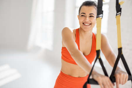 Portrait of a cheerful athletic woman training on suspension straps at white sunny gym. training on fitness straps, happiness and healthy lifestyle