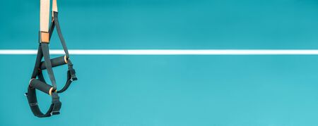 Sport accessories. Suspension trx straps on blue background. Advertising banner