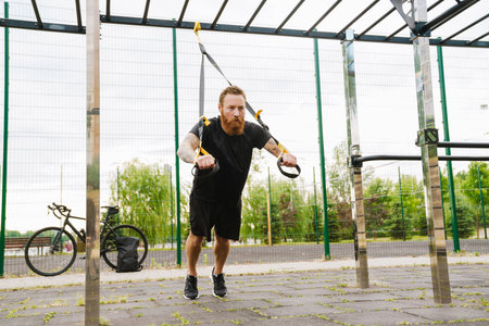 Ginger bearded sportsman doing exercise while working out on playground outdoors