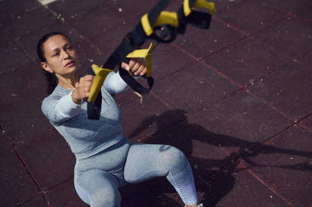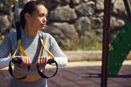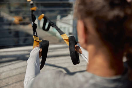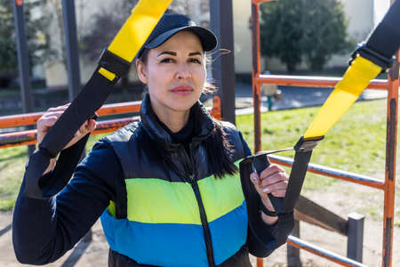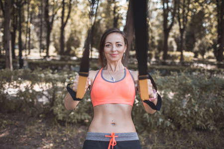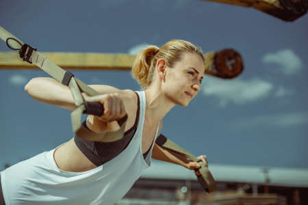 Upper body exercise concept. Image of beautiful woman exercising with suspension straps outside.