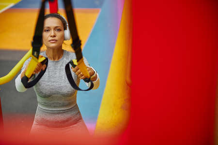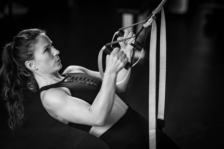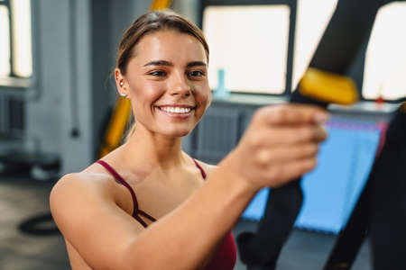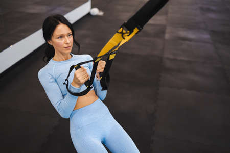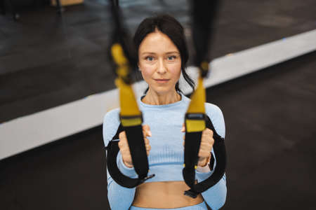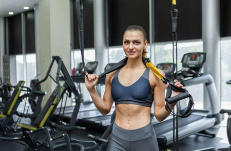 Portrait of beautiful woman doing hard suspension training with fitness straps in a fitness center. Healthy and sporty lifestyle concept.